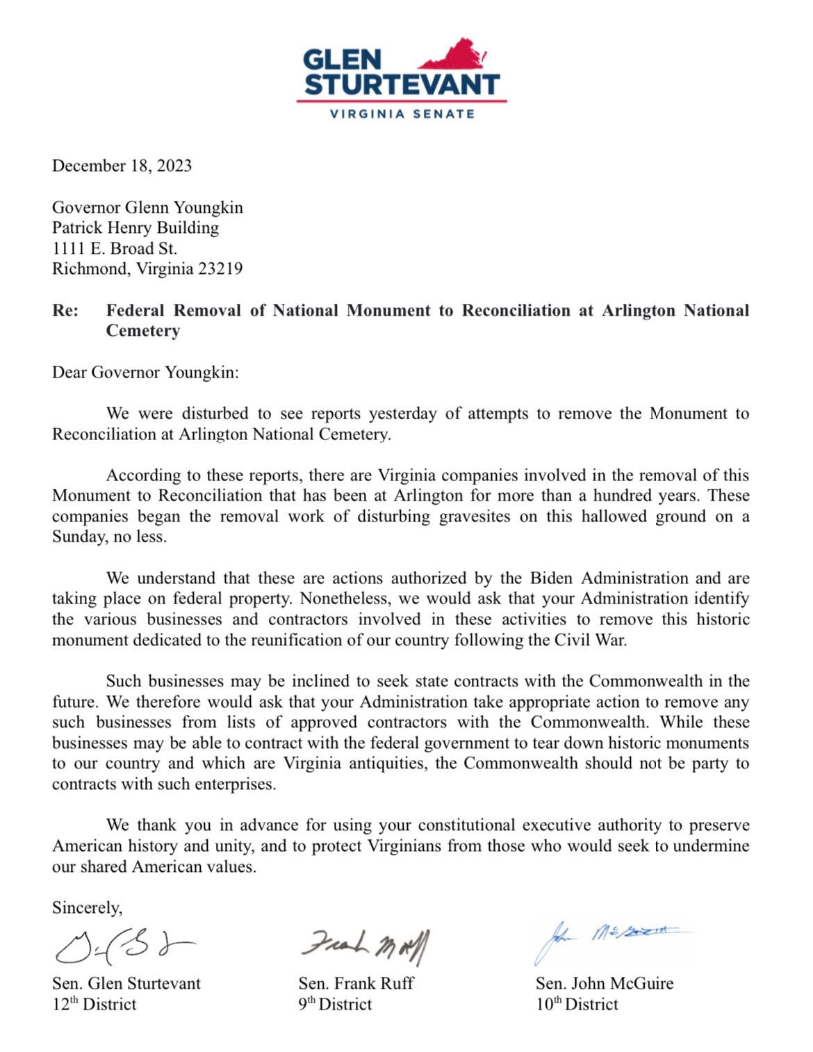 Those Senators were upset about the removal of a Confederate statue in Arlington National Cemetery. The federal government decided to remove the statue after a lengthy Congressional process and legal battle. Youngkin has expressed that the statue will be moved to New Market Battlefield State Historical Park.