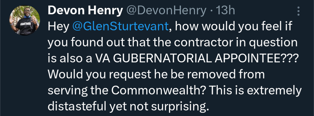 Devon Henry of Team Henry Enterprises tipped his hand as one of the contractors removing the Confederate monument when he tweeted “Hey @GlenSturtevant, how would you feel if you found out that the contractor in question is also a VA GUBERNATORIAL APPOINTEE??? Would you request he be removed from serving the Commonwealth? This is extremely distasteful yet not surprising.”