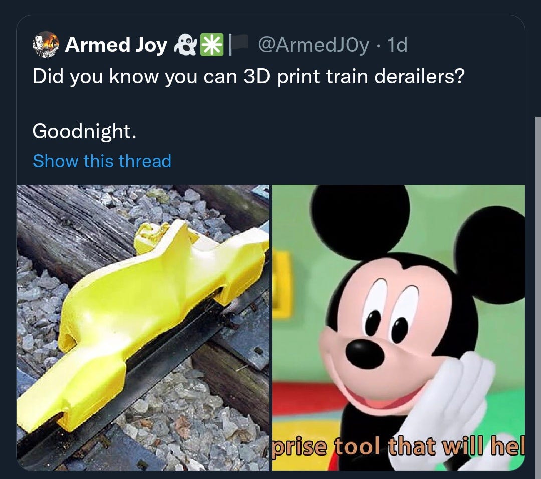 Most recently Magnus was revealed to be this Twitter account encouraging 3D printed tools to cause train derailments.